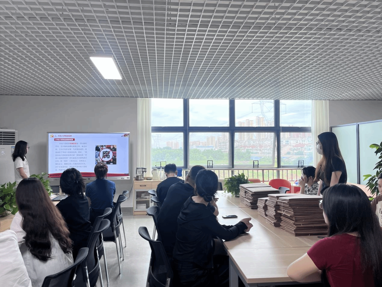蒋彭阳带领大家对中央八项规定进行解读,带领全体学生党员深入贯彻中央八项规定精神学习教育。活动中,学生党员踊跃参与,表达了自己对中央八项规定的认识与看法。通过系统讲解,全体党员清晰认识到:中央八项规定是改进工作作风、密切联系群众的“铁规矩”,其精神实质在于厉行勤俭节约、反对奢侈浪费、坚持廉洁从政、倡导务实作风。