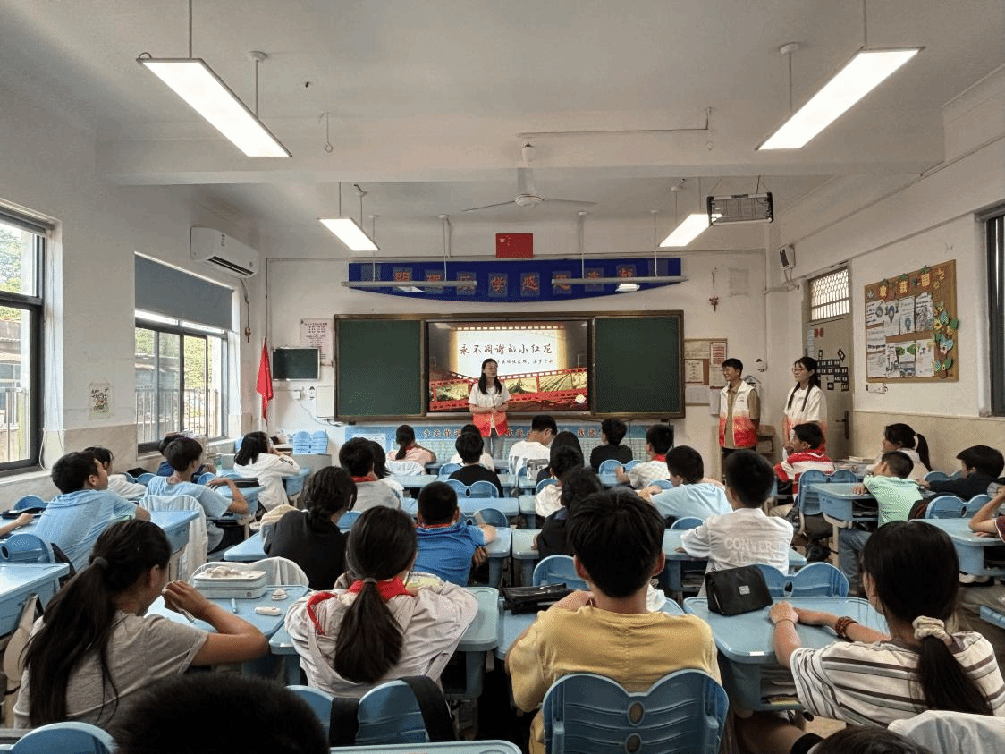 为进一步深入学习贯彻习近平新时代中国特色社会主义思想,弘扬革命精神,厚植青少年爱党爱国情怀,5月13日下午,yl6809永利官网“初心”宣讲团走进武昌未来实验小学六年级D班,开展了一场主题为“永不凋零的小红花”的红色宣讲活动。